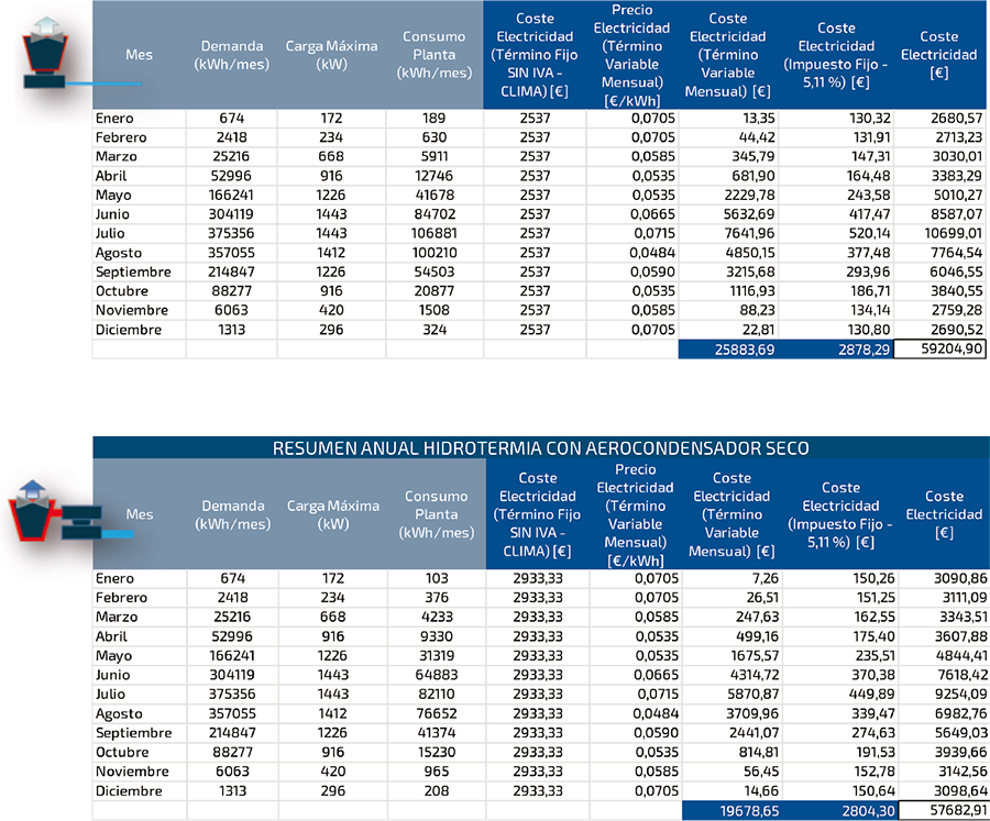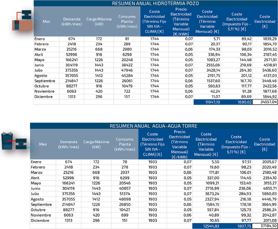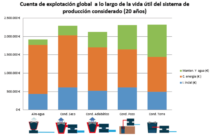 Igualmente, la ponencia completa presentada incluía, además de los costes energéticos asociados a los equipos de producción de energía térmica, otros costes de implantación de los distintos sistemas. Se consideraron, la adquisición de equipos, instalación, obra civil, consumo de agua para torres, así como otros consumos secundarios (bombas, ventiladores…) y costes de mantenimiento asociados a limpieza, consumibles, cambios de filtro en pozo, desinfección y seguridad sanitaria, etc.