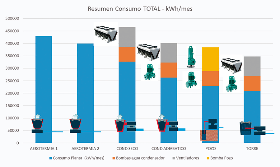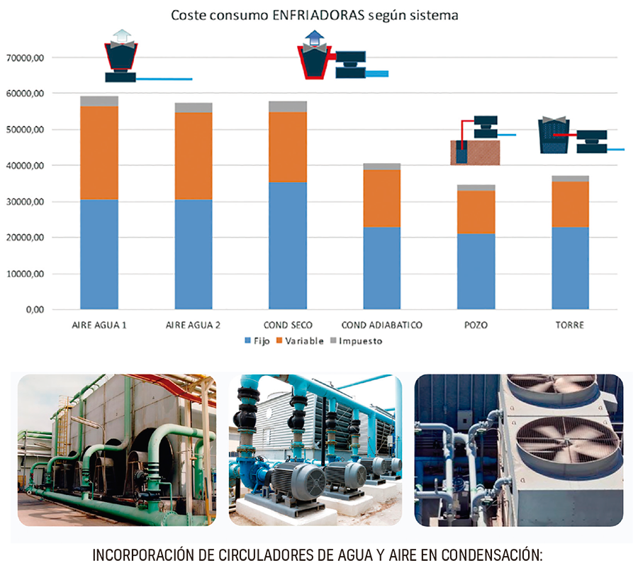 En este primer análisis parece que el coste de consumo de los equipos (plantas enfriadoras) más favorable es el de los sistemas condensados por agua con pozo y con torre, sin embargo, para completar el comparativo, hay que tener en cuenta el consumo asociado a elementos necesarios de transporte de energía que conciernen exclusivamente a la producción, como son las bombas de circulación de agua, la bomba de pozo o los ventiladores.