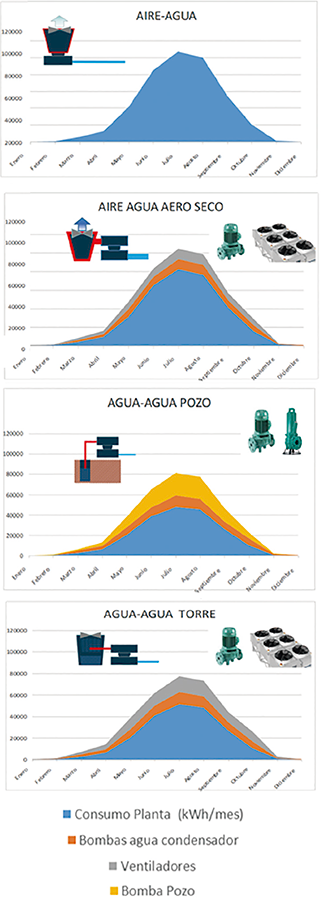 Considerando el rendimiento a cargas parciales y teniendo en cuenta la variación de las condiciones de condensación de cada supuesto, podemos obtener la curva de consumo (demanda de energía eléctrica) según el sistema de producción elegido: