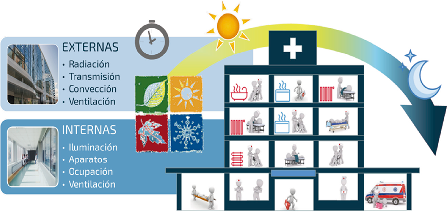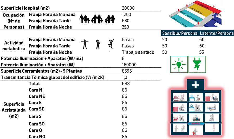 En la definición del edificio se debe considerar la superficie del hospital, la ocupación en distintas franjas horarias, que está afectada por los residentes, visitas y personal sanitario, la actividad metabólica de los ocupantes, la iluminación y el calor emitido por los aparatos eléctricos, la epidermis del edificio y tipo de cerramientos (Transmitancia), así como su orientación.