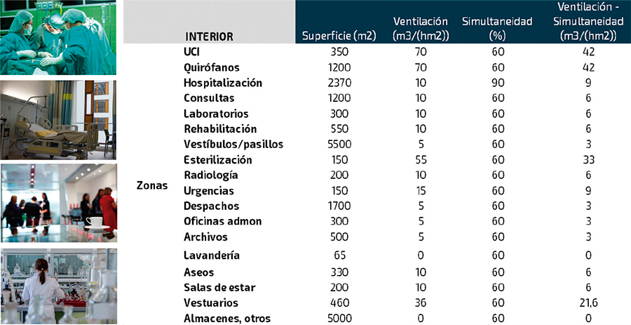 La evaluación de la carga de ventilación es diferente en función de la zona del hospital y de la ocupación.