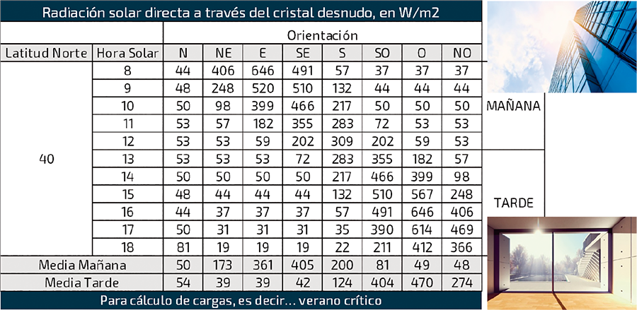 Es muy importante la orientación del edifico y su acristalamiento para considerar el efecto de la radiación solar. Se consideran los siguientes valores de radiación en función de la hora solar y la latitud.
