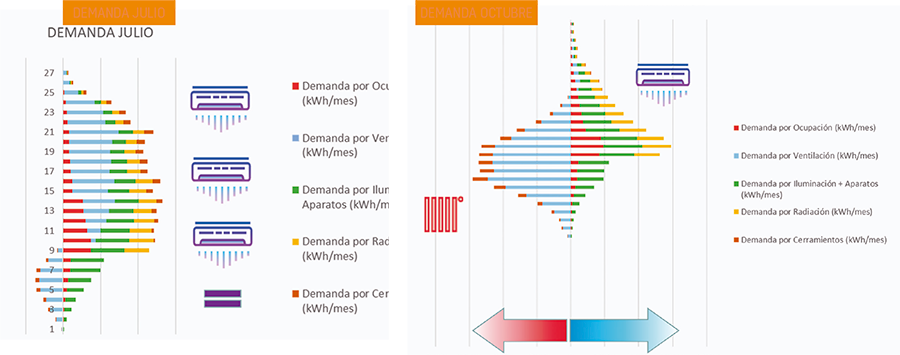 En meses como enero la demanda de frío es altísima, fundamentalmente debida a la transmisión por los cerramientos y al aire de ventilación, que está por debajo de la temperatura de confort del edificio. Las cargas positivas debidas a la ocupación, radiación e iluminación ayudan a calentar el edificio, pero no son suficientes para contrarrestar la pérdida de calor, por lo que será necesario aportar calor en todo momento.