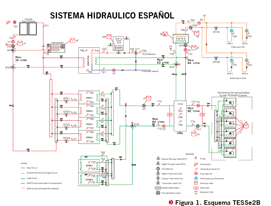 El sistema Tesse2b combina los colectores solares y la bomba de calor geotérmica con el innovador sistema de almacenamiento de energía térmica latente y los pozos geotérmicos con PCM. Los componentes principales del sistema son: los colectores solares, la bomba de calor, los pozos geotérmicos, los tanques de almacenamiento de energía térmica caliente, los tanques de almacenamiento de energía térmica fría, el sistema de ACS y los dispositivos de calefacción/refrigeración de la casa. Todo ello se administra mediante un sistema de control avanzado con autoaprendizaje, con el fin de optimizar su rendimiento. La configuración general del sistema TESSe2b se muestra en la Figura 1.