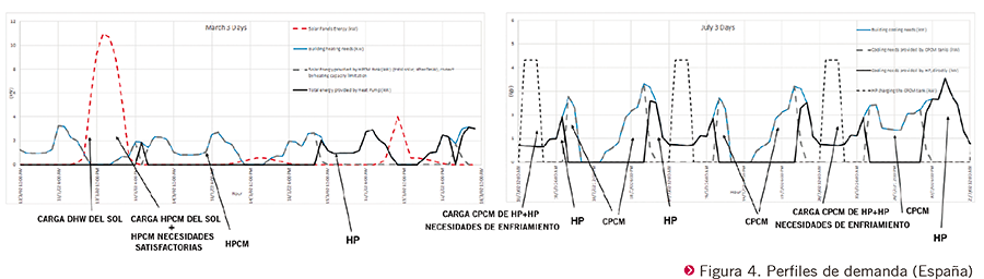 La Figura 4 presenta la demanda de calefacción y refrigeración prevista para el caso español. Se muestran tres días consecutivos tanto de invierno como verano. La Figura 4 también muestra la radiación incidente hacia los colectores solares y la parte de la demanda de calefacción y refrigeración que cubre directamente la bomba de calor geotérmica y los tanques de almacenamiento de energía térmica. Los resultados presentados en la Figura 4 muestran claramente cómo el sistema de almacenamiento térmico puede optimizar el uso de la energía solar y proporciona flexibilidad al sistema para que el funcionamiento de la bomba de calor sea en los períodos en que el precio de la electricidad sea más bajo.