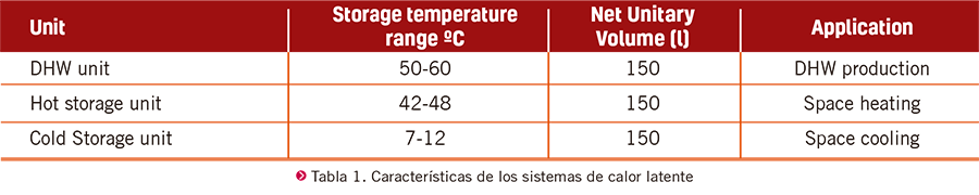 TESSe2b usa tanques de plástico modulares con un serpentín sumergido, que actúa como intercambiador de calor. Cada tanque tiene una capacidad de almacenamiento de aproximadamente 150 litros. La capacidad total depende del número de tanques modulares y de las propiedades de los PCM. Como se muestra en la Figura 1, el tanque de almacenamiento de calor tiene dos circuitos principales, uno para cargar el tanque de almacenamiento a través de los colectores solares y otro para descargar la energía almacenada proporcionando calor al edificio. Este circuito también se utiliza para cargar los tanques de almacenamiento mediante la bomba de calor geotérmica. Los tanques de almacenamiento de energía para refrigeración son similares pero con un solo circuito principal, que se utiliza para proporcionar refrigeración a la casa, mediante la fusión de los PCM. El mismo circuito se usa para almacenar frío solidificando de nuevo los PCM utilizando la bomba de calor geotérmica cuando funciona en modo de enfriamiento. El tanque diseñado para ACS puede proporcionar unos 200 l/día de agua caliente. El diseño del tanque de ACS es similar al tanque de almacenamiento de calor. Sin embargo, los circuitos de los intercambiadores de calor son más largos para el tanque de ACS, para aumentar el ratio de transferencia de calor instantánea al valor requerido para producir ACS. La Tabla 1 presenta las características generales de las unidades de almacenamiento térmico desarrolladas en el proyecto TESSe2b.