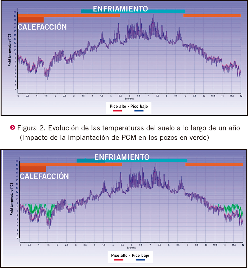 Durante el enfriamiento, por el contrario, aumentará (Figura 2). Como la transferencia de calor en el suelo es principalmente conductora y su difusividad térmica es baja, esto conduce a una respuesta térmica en el suelo mucho más lenta de lo que requiere la bomba de calor, lo que resulta en la transmisión de ondas térmicas en el suelo a través de los BHE. Esto causa un menor coeficiente de rendimiento (COP) de la bomba de calor (GSHP), ya que se está modificando la temperatura del suelo. Para mejorar la efectividad de los BHE, añadir PCM en los pozos se considera un medio eficaz para almacenar energía térmica en los BHE. Esto reduce las fluctuaciones de la temperatura del suelo, suavizando la onda térmica generada, y aumentando así el rendimiento estacional del sistema. El impacto esperado en una aplicación de calefacción se ilustra en la Figura 2 (figura inferior).
