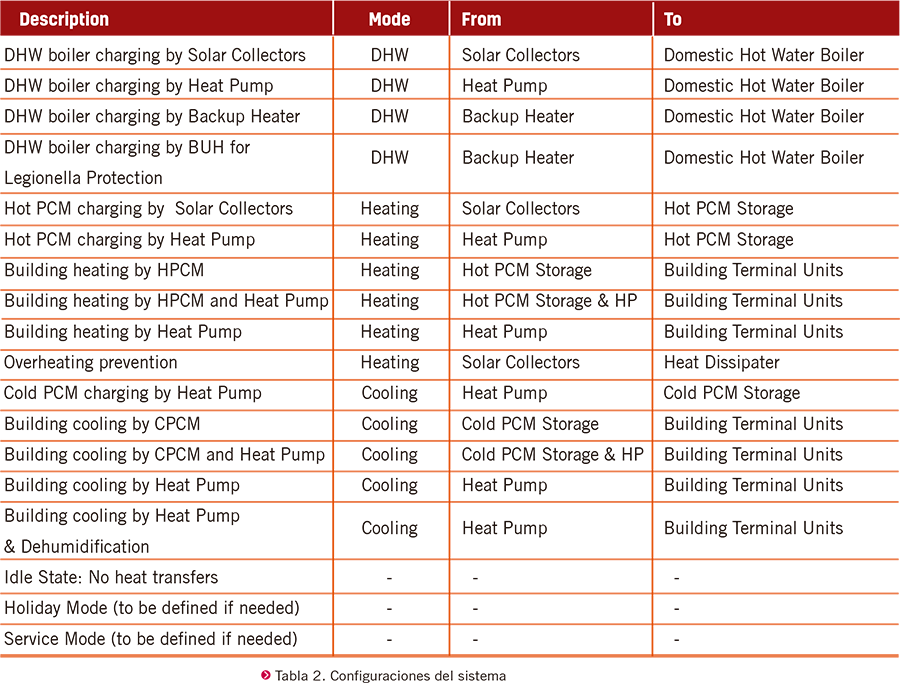 Las funciones principales que TESSe2b garantiza son: producción de agua caliente sanitaria, refrigeración y calefacción. Se incluyen otros tres modos de funcionamiento, el estado inactivo: sin transferencias de calor (modo de reposo), modo de vacaciones y modo de servicio. La tabla 2 muestra todos los modos de funcionamiento de TESSe2b.