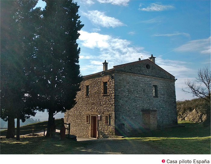 El edificio se encuentra en Calonge de Segarra, Cataluña. Es una masia antigua de 130 m2 distribuidos equitativamente en dos pisos. Las paredes del edificio están hechas de piedra caliza y tienen una capa delgada de poliuretano como aislamiento térmico. La simulación de construcción de energía predijo una potencia de calefacción de 11.3 kW y de 5.04 kW para refrigeración. La demanda energética anual es de 46.38 kWh/(m2•año) para calefacción y 8.93 kWh/(m2•año) para refrigeración. Comparándolo con los resultados obtenidos con el envolvente térmico de referencia, vemos que el edificio real tiene un perfil energético similar, con una demanda ligeramente más alta que la de referencia.