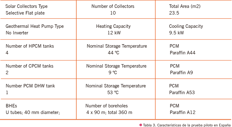 Las características principales de la prueba piloto de TESSe2b en España se presentan en la Tabla 3. El número de tanques de almacenamiento térmico calientes se seleccionó para maximizar que la demanda de calefacción de la casa esté cubierta por la solar térmica. El número de tanques de almacenamiento térmico fríos se seleccionó según un criterio diferente: la capacidad del tanque frío se dimensionó para minimizar el funcionamiento de la bomba de calor geotérmica durante las horas en que la tarifa eléctrica sea más cara.