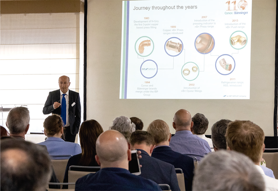 A continuación Bakhtiari hizo un repaso histórico de los principales hitos de sus productos que han significado una importante aportación al sector de la fontanería y el HVAC. En la actualidad el Grupo tiene su producción centrada en España y Polonia con distribución a nivel global, con 12.500 referencias en 20 grupos de productos principales, 22.000 millones de accesorios instalados hasta la fecha y 300 aprobaciones y certificaciones a nivel mundial. Cuenta en la actualidad con 4 centros de distribución que dan servicio a más de 100 países a nivel mundial, 9 oficinas propias y 12 distribuidores a nivel global, con oficinas propias en diferentes puntos del planeta (UK, Alemania, Francia, Italia, España, Polonia, USA, Golfo y China), más de 70.000m2 de fabricación y distribución en Europa y 500 millones de capacidad global para accesorios y válvulas. Todo ello hace de Conex | Bänninger una compañía sólida y puntera en la producción y distribución de accesorios para fontanería y HVACR. Ha sido la primera empresa en el mundo en desarrollar accesorios de aleación de cobre para instalaciones de ACR para altas prestaciones, así como accesorios prensados para instalaciones de ACR con perfil > B < , concluyó Mano Bakhtiari.