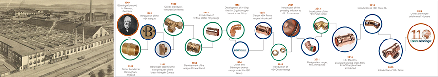En la rueda de prensa de la mano del CEO del Grupo IBP, Mano Bakhtiari, pudimos conocer la compleja historia de la empresa llena de éxitos y la evolución de estos 110 años con sus diferentes hitos. Sus orígenes se remontan a 1909 cuando el empresario suizo Carl Bänninger, a la edad de 65 años, fundaba la compañía en Giessen, Alemania. Inicialmente la actividad era una fundición de hierro que con el tiempo y a lo largo de 70 años ha pasado por tres generaciones de la familia Bänninger. Entre tanto se creaba en 1919 en Birmingham, Inglaterra, la Compañía de Ingeniería Sanbra, que más tarde pasaría a denominarse Conex-Sanbra Ltd, y cuya actividad era la fabricación de accesorios de latón para aplicaciones de agua.