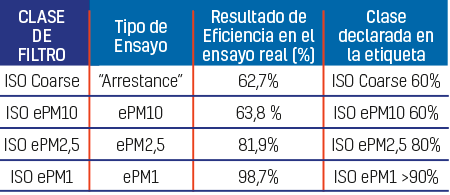 La clasificación que se ha de declarar de acuerdo a la norma es la correspondiente a la eficiencia obtenida en el test para la primera fracción de partículas de 1; 2,5 o 10 que supera el 50%. La declaración debe incluir el valor obtenido en el ensayo redondeado al múltiplo de 5% inferior más cercano. El valor superior a 95% se declara como >95%. De acuerdo a los resultados del ensayo un filtro podría ajustarse a los requisitos de más de un grupo, por ejemplo un filtro de clase ISO ePM1 85% también podría clasificarse ISO ePM10 >95%, sin embargo de acuerdo a la norma solo podría mostrar en la etiqueta un grupo, normalmente el más exigente.