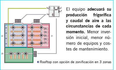 Los nuevos equipos roof-top de CIAT ofrecen la posibilidad de trabajar con volumen de aire variable y zonificación hasta en 4 zonas, modificando el caudal de aire y la capacidad del equipo en función de las necesidades y zonas activas y controlando unas compuertas motorizadas para cada zona.