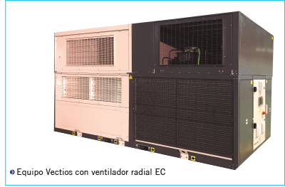Existe la opción de incorporar un ventilador radial de tipo EC de manera que las unidades comentadas anteriormente puedan instalarse en salas técnicas ventiladas adecuadamente.