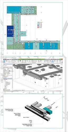 :: La instalación de ventilación / aire acondicionado tiene herramientas específicas para poder trazar los conductos y utilizar los datos de las máquinas de extracción y refrigeración/calefacción junto con el volumen de los espacios para diseñar el tamaño de los conductos y la posición de las tomas.