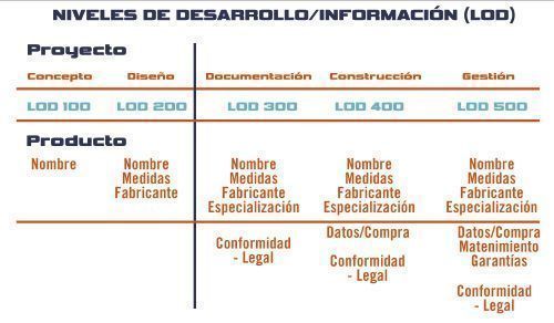 Como práctica general, cada etapa de un proyecto en BIM es denominada como un Nivel de Desarrollo – Level of Development (LOD). Cada etapa establece las necesidades de información del proyecto en cada disciplina. Estas necesidades deberán ser cumplimentadas para que el proyecto pueda continuar.