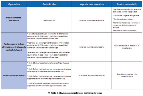 En el caso de detectarse fugas leves bastará con subsanarlas lo antes posible y cumplimentar debidamente el libro de registro de la instalación frigorífica. Se informará al titular de la instalación y se comprobará su correcta reparación en el plazo máximo de un mes a partir de la fecha en la que detectó la fuga. Para más información en cuanto a sistemas de detección de fugas. A continuación, se muestra las obligaciones del usuario en cuanto a revisiones obligatorias y controles de fugas, en un cuadro resumen.