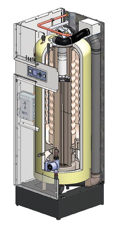 Los gases de la combustión descienden por un intercambiador humos/agua en acero inoxidable, hasta terminar en un recuperador de humos inferior que precalienta al agua de red que entra al generador, consiguiendo de esta forma aprovechar el calor latente presente en los humos de la combustión mediante un proceso de condensación del vapor de agua de los mismos.