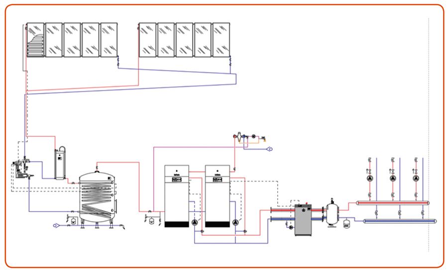 Teniendo en cuenta que los generadores de A.C.S. HEAT MASTER TC también disponen de conexión para circuitos de calefacción, se plantea utilizar su potencia disponible para producir calor para el circuito de calefacción, en combinación con una caldera de pie de condensación COMPACT CONDENS 210 (potencia útil de 210 kW). De esta manera, se dispone de una cascada combinada de 3 calderas para esta demanda, pero con los beneficios y ahorros energéticos del sistema HEAT MASTER TC en producción de agua caliente sanitaria. En la siguiente imagen se observa el esquema hidráulico de la instalación considerada: