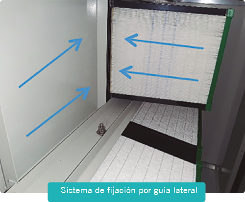 Por reducir dimensiones del equipo, para etapas previas de filtración (filtros de polvo grueso y eficacia media) se utiliza en ocasiones un sistema de fijación mediante guía lateral (corredera).