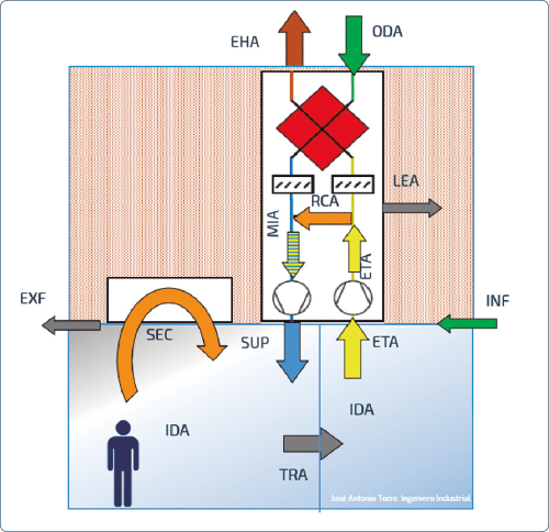 Igualmente, en los locales también nos encontramos unidades de climatización (ejemplo splits) que recirculan de manera continua el aire del local, este aire lo denominamos aire secundario (SEC). Por último, el aire que expulsamos al exterior (EHA) puede ser la misma cantidad que el aire exterior introducido o diferente, dependiendo de que queramos mantener el local en sobre presión o depresión.
