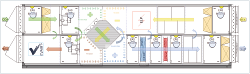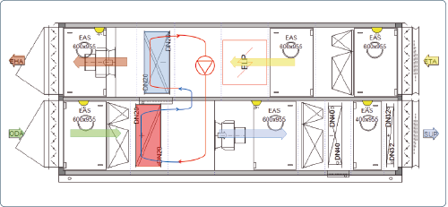 El sistema se describe en el dibujo adjunto. En él se aprecia como teniendo los ventiladores de aire nuevo sobrepersionando el sistema y los de aire extraído (depresión) aspirando del sistema, se consigue que en caso de hubiera fuga entre uniones, paredes, recuperador, puertas, etc… la posible mezcla de flujos de corriente de aire siempre, sería que el aire limpio entraría en el flujo del aire que va a ser expulsado al exterior (extraído), pero nunca al revés evitando de este modo la transmisión de partículas y contaminación del aire que va a ser introducido SUP.