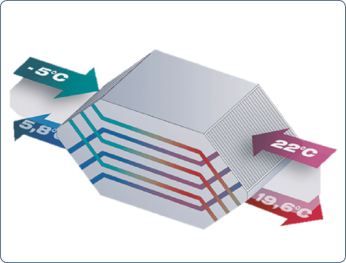 El sistema de recuperación transfiere la energía del aire extraído al aire introducido. Para evitar durante este proceso la transmisión de partículas entre ambas corrientes de aire, tradicionalmente se ha apostado por un sistema de recuperación de baterías de calor las cuales mediante una bomba de circulación de agua calientan el fluido calo portador en un lado de climatizador y ceden ese calor en el otro lado.