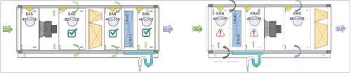 Independientemente del caudal de fuga mencionado, existen una disposición de los ventiladores dentro del equipo que impide por completo esta transmisión de partículas, ya que se va a mantener el aire exterior (ODA) siempre en sobrepresión sobre el aire que se quiere extraer (EHA).