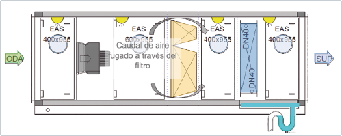 En unidades de climatización Utas unidireccionales que no incorporan este sistema de recuperación, estos conceptos siguen siendo igualmente aplicables y es importante que el ventilador esté trabajando en sobre presión sobre la mayor parte de componentes del climatizador como son las baterías, de este modo, las posibles fugas a través de puertas, paneles o incluso a través del sifón del desagüe van a ser siempre “exfiltraciones” y nunca infiltraciones.