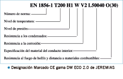 Designación: Según la norma UNE EN 1856-1 o UNE EN 1856-2 de la chimenea elegida en cada caso.