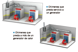 Las chimeneas colectivas en cascada que tengan la misma configuración para la evacuación de los productos de la combustión, pueden tener el conducto de evacuación común a varios generadores, siempre y cuando la suma de la potencia sea igual o menor a 400 kW.