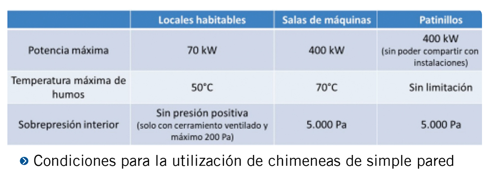 Entre otras características de diseño, la norma establece los requisitos para la utilización de chimeneas de simple pared, que se resumen en la siguiente tabla: