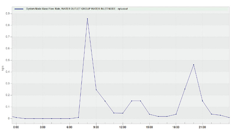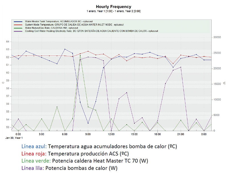 En ese momento, el generador instantáneo de apoyo entra en funcionamiento para cubrir ese pico de consumo (línea verde en el gráfico). A partir de ese momento, vemos que el sistema de bombas de calor (línea lila) va trabajando progresivamente a lo largo del día para remontar la temperatura de los tanques. El generador de apoyo solo entrará en funcionamiento para ir manteniendo caliente el anillo de recirculación.