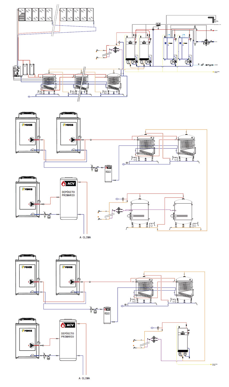 - Sistema solo BC: Climatización con bomba de calor de baja temperatura de 200 kW (refrigerante R32) y ACS con dos bombas de calor de alta temperatura de 28 kW (refrigerante R290).