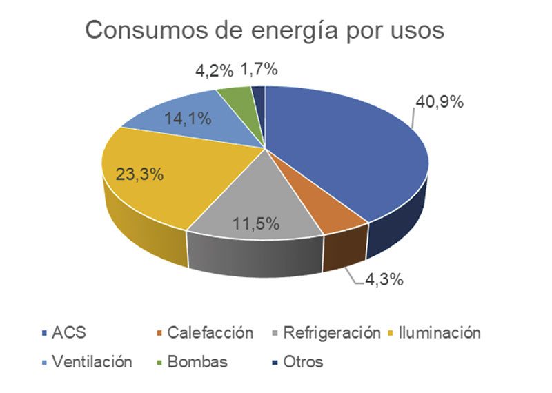 - Sistema clásico: Calefacción con 2 calderas de condensación de 120 kW, refrigeración con enfriadora y ACS con dos generadores instantáneos de condensación de 120 kW y solar térmica para cumplimiento de HE4.