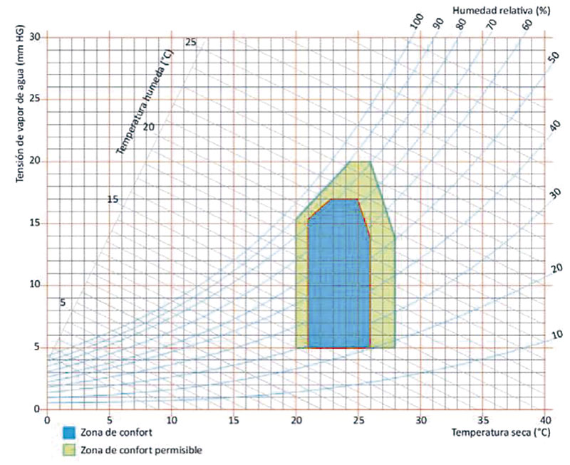 Por ello, la horquilla de las condiciones de confort contempla las múltiples combinaciones de los parámetros descritos y viene definida entre los 21ºC y los 26ºC de temperatura seca o ambiente y del 30% al 70% de Humedad relativa.