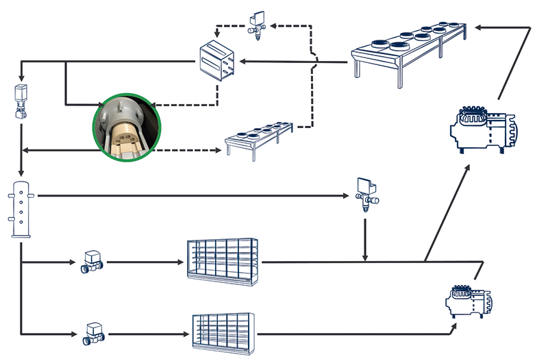 El efecto de subenfriamiento se obtiene a través de un flujo dedicado de evaporación de CO2 que se expande en sub enfriador hasta una presión superior a la del recipiente.