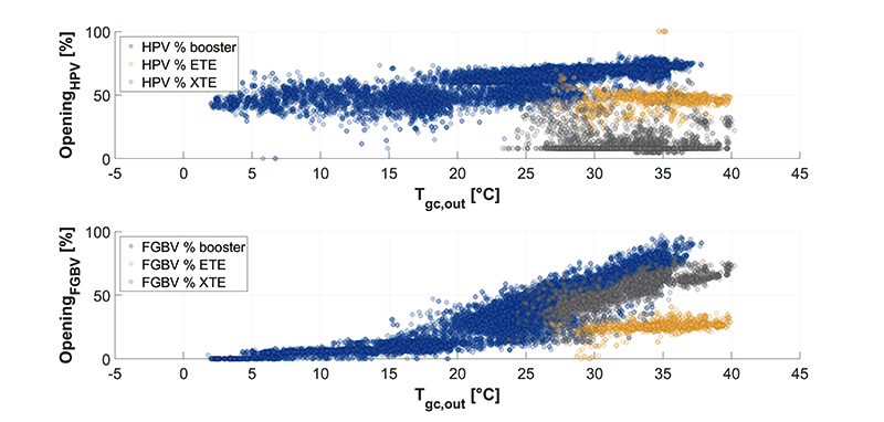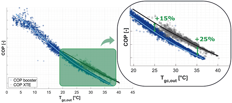 Por su lado ETE incluye un compresor dedicado que devuelve el vapor de baja presión de salida del sub enfriador a la entrada del gas-cooler mientras que por su lado, XTE aprovecha la energía recuperada durante la expansión transcrítica para comprimir el vapor de baja presión de salida del sub enfriador en un gas-cooler dedicado. En otras palabras XTE puede garantizar una cierta cantidad de subenfriamiento a la salida del gas-cooler “gratuitamente”, es decir, recuperando energía dentro del sistema de refrigeración y mejorando significativamente la eficiencia del sistema en un amplio rango de temperaturas ambiente.