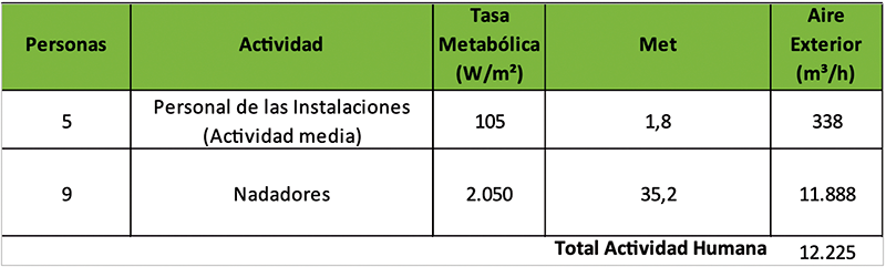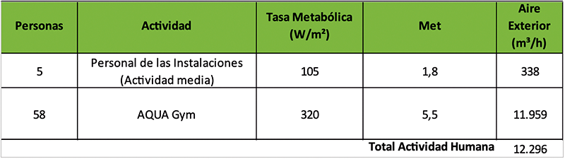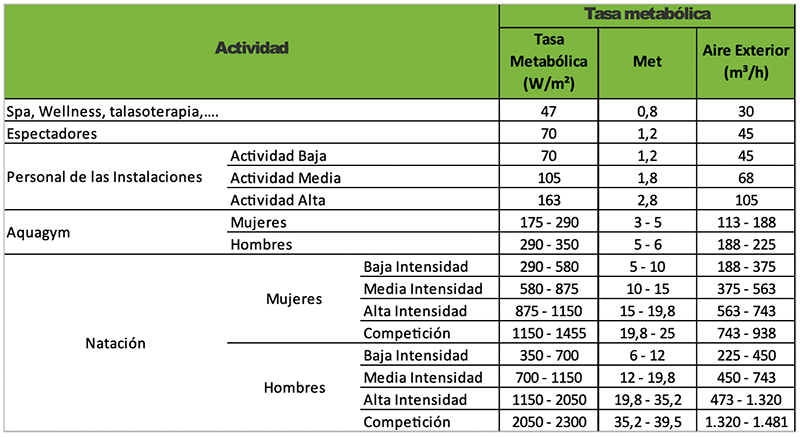 Por tanto, los valores de ventilación en las piscinas climatizadas en función de la actividad metabólica desarrollada serían, de forma orientativa: