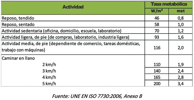 Este sería el gasto energético de una persona en actividad sedentaria, para otras actividades podemos encontrar información en la UNE EN ISO 7730:2006 Determinación analítica e interpretación del bienestar térmico mediante el cálculo de los índices PMV y PPD y los criterios de bienestar térmico, donde se muestra, en su Anexo B, la siguiente tabla con tasas metabólicas para diferentes actividades.