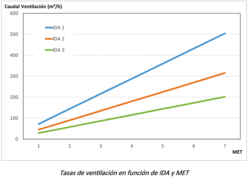 Aquí es donde empiezan a saltar las contradicciones, las tasas de ventilación raramente son las indicadas en la tabla de RITE, referidas a 1.2 MET, de hecho, la tabla es realmente una gráfica como la siguiente.