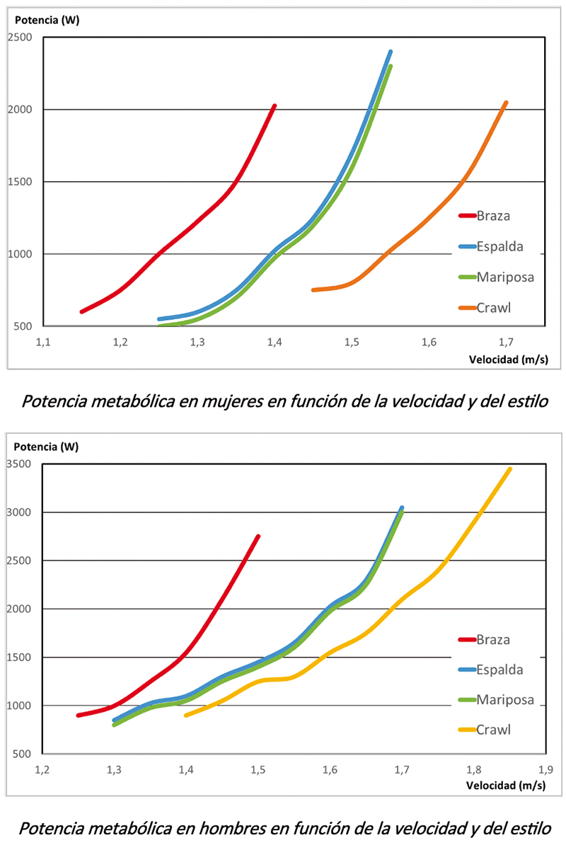 En el texto se indica que los resultados obtenidos, para mujeres y hombres, a nivel de potencia metabólica son, en función de la velocidad y el estilo de natación de: