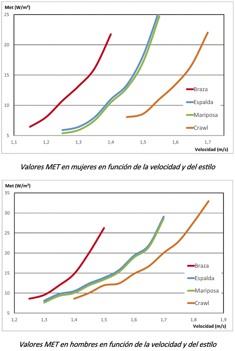 Para el caso de piscinas climatizadas nos ayudaremos del estudio de Sergei Kolmogorov, Andrei Vorontsov y João Paulo Vilas-Boas, publicado en MDPI (Multidisciplinary Digital Publishing) en noviembre de 2021, bajo el título de Metabolic Power, Active Drag, Mechanical and Propelling Efficiency of Elite Swimmers at 100 Meter Events in Different Competitive Swimming Techniques.
