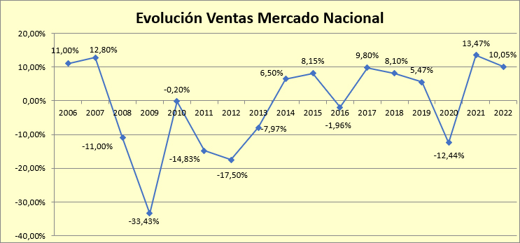 Tras un buen 2021 en el que se recuperó el terreno perdido en 2020, el año más afectado por la pandemia, en 2022 las ventas en el mercado nacional de nuestro sector han vuelto a tener un buen comportamiento, creciendo un 10,05%.